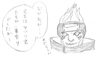 大蛇丸様が暁を抜けたのが確か8年前だったはずなので、 おそらくイタチとは在籍期間がカブってませんよね。 う わ 、 何 こ の 適 当 設 定 漫 画 … 。 サソリが 「昔は大蛇丸と組んでた」 とか何とか言った時に ひらめきだけで描いたものなので深く考えてませんでした。 鬼鮫の目玉が飛び出てきそうで気持ち悪いなあ。